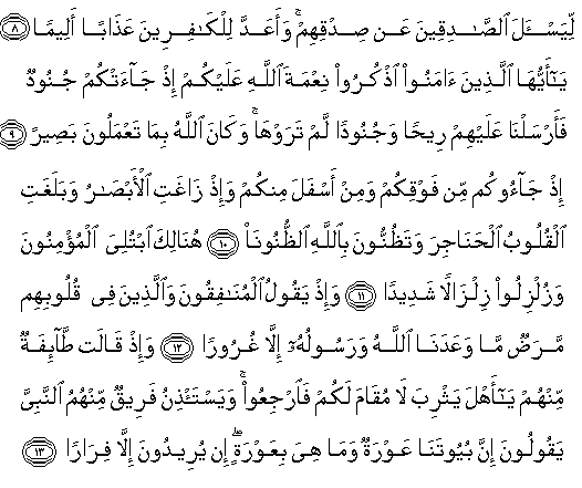 Kafirlere ise acı bir azap hazırlamıştır. 9. Ey iman edenler, Allah'ın üzerinizdeki nimetini hatırlayın. Hani size ordular gelmişti; böylece Biz de onların üzerine, bir rüzgar ve sizin görmediğiniz ordular göndermiştik. Allah, yaptıklarınızı görendir. 10. Hani onlar, size hem üstünüzden, hem alt tarafınızdan gelmişlerdi; gözler kaymış, yürekler hançereye gelip dayanmıştı ve siz Allah hakkında (birtakım) zanlarda bulunuyordunuz. 11. İşte orada, iman edenler, sınanmış ve şiddetli bir sarsıntıyla sarsıntıya uğratılmışlardı. 12.Hani, münafık olanlar ve kalplerinde hastalık bulunanlar: "Allah ve Resulü, bize boş bir aldanıştan başka bir şey vadetmedi" diyorlardı. 13. Onlardan bir grup da hani şöyle demişti: "Ey Yesrib (Medine) halkı, artık sizin için (burada) kalacak yer yok, şu halde dönün." Onlardan bir topluluk da: "Gerçekten evlerimiz açıktır" diye Peygamberden izin istiyordu; oysa onlar(ın evleri) açık değildi. Onlar yalnızca kaçmak istiyorlardı. |