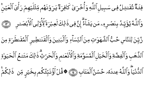 sahipleri için gerçekten bir ibret vardır. 14.Kadınlara, oğullara, kantar kantar yığılmış altın ve gümüşe, salma güzel atlara, hayvanlara ve ekinlere duyulan tutkulu şehvet insanlara 'süslü ve çekici' kılındı. Bunlar, dünya hayatının metaıdır. Asıl varılacak güzel yer Allah Katında olandır. |