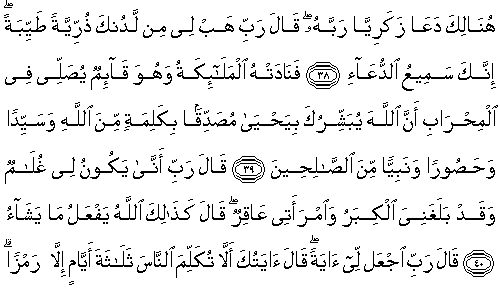 39.O mihrapta namaz kılarken, melekler ona seslendi: "Allah, sana Yahya'yı müjdeler. O, Allah'tan olan bir kelimeyi (İsa'yı) doğrulayan, efendi, iffetli ve salihlerden bir peygamberdir." 40.Dedi ki: "Rabbim, bana gerçekten ihtiyarlık ulaşmışken ve karım da kısırken nasıl bir oğlum olabilir?" "Böyledir" dedi, "Allah dilediğini yapar." |