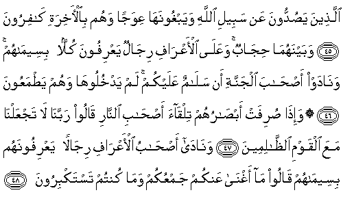 arayanlar ve ahireti tanımayanlardır." 46.İki taraf arasında bir engel ve burçlar (A'raf) üstünde hepsini yüzlerinden tanıyan adamlar vardır. Cennete gireceklere: "Selam size" derler, ki bunlar, henüz girmeyen fakat (girmeyi) 'şiddetle arzu edip umanlardır.' 47.Gözleri cehennem halkından yana çevrilince: "Rabbimiz, bizi zalimler topluluğuyla birlikte kılma" derler. 48.Burcun üstündeki adamlar, kendilerini yüzlerinden tanıdıkları (ileri gelen birtakım) adamlara seslenerek derler ki: "Ne (güç ve servet) toplamış olmanız, ne büyüklük taslamanız (istikbarınız) size bir yarar sağlamadı." |