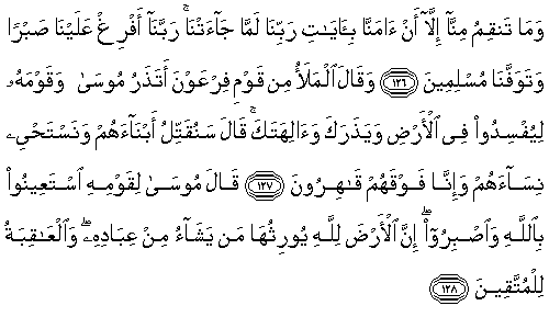 üstümüze sabır yağdır ve bizi Müslüman olarak öldür." 127.Firavun kavminin önde gelenleri, dediler ki: "Musa ve kavmini bu toprakta (Mısır'da) bozgunculuk çıkarmaları, seni ve ilahlarını terk etmeleri için mi (serbest) bırakacaksın?" (Firavun) Dedi ki: "Erkek çocuklarını öldüreceğiz ve kadınlarını sağ bırakacağız. Hiç şüphesiz biz, onlara karşı kahir bir üstünlüğe sahibiz." 128.Musa kavmine: "Allah'tan yardım dileyin ve sabredin. Gerçek şu ki, arz Allah'ındır; ona kullarından dilediğini mirasçı kılar. En güzel sonuç muttakiler içindir" dedi. |