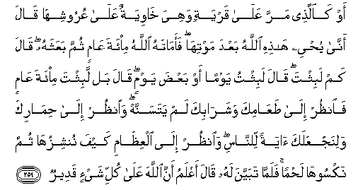 | 259.Ya da altı üstüne gelmiş, ıssız duran bir şehre uğrayan gibisini (görmedin mi?) Demişti ki: "Allah, burasını ölümünden sonra nasıl diriltecekmiş?" Bunun üzerine Allah, onu yüz yıl ölü bıraktı, sonra onu diriltti. (Ve ona) Dedi ki: "Ne kadar kaldın?" O: "Bir gün veya bir günden az kaldım" dedi. (Allah ona:) "Hayır, yüz yıl kaldın, böyleyken yiyeceğine ve içeceğine bak, henüz bozulmamış; eşeğine de bir bak; (bunu yapmamız) seni insanlara ibret-belgesi kılmamız içindir. Kemiklere de bir bak nasıl biraraya getiriyoruz, sonra da onlara et giydiriyoruz?" dedi. O, kendisine (bunlar) apaçık belli olduktan sonra dedi ki: "(Artık şimdi) Biliyorum ki gerçekten Allah, herşeye güç yetirendir." | ![]() |