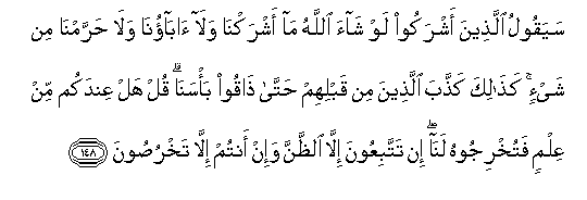 | 148.Şirk koşanlar diyecekler ki: "Allah dileseydi ne biz şirk koşardık, ne atalarımız ve hiçbir şeyi de haram kılmazdık." Onlardan öncekiler de, Bizim zorlu-azabımızı tadıncaya kadar böyle yalanladılar. De ki: "Sizin yanınızda, bize çıkarabileceğiniz bir ilim mi var? Siz ancak zanna uymaktasınız ve siz ancak "zan ve tahminle yalan söylersiniz." | ![]() |
