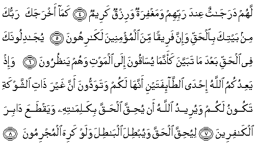 bağışlanma ve üstün bir rızık vardır. 5.Rabbin seni evinden hak uğrunda (savaşa) çıkardığında mü'minlerden bir grup isteksizdi. 6. (Herşey) Açıkça ortaya çıktıktan sonra bile, sanki kendileri, göz göre göre ölüme sürükleniyorlarmış gibi, seninle hak konusunda tartışıp duruyorlardı. 7.Hani Allah, iki topluluktan birinin muhakkak sizin olacağını vadetmişti; siz de güçsüz olanın sizin olmasını istiyordunuz. Oysa Allah, sözleriyle hakkın ve inkar edenlerin arkasını kesmek (kökünü kurutmak) istiyordu. 8. O, suçlu-günahkarlar istemese de, hakkı gerçekleştirmek ve batılı geçersiz kılmak için (böyle istiyordu.) |