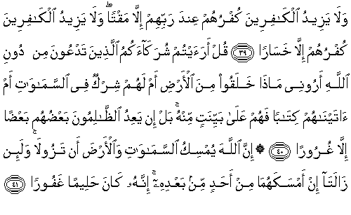 40. De ki: "Siz, Allah'ın dışında taptığınız ortaklarınızı gördünüz mü? Bana haber verin; yerden neyi yaratmışlardır? Ya da onların göklerde bir ortaklığı mı var? Yoksa Biz onlara bir kitap vermişiz de onlar bundan (dolayı) apaçık bir belge üzerinde midirler? Hayır, zulmedenler, birbirlerine aldatmadan başkasını vadetmiyorlar. 41.Şüphesiz Allah, gökleri ve yeri zeval bulurlar diye (her an kudreti altında) tutuyor. Andolsun, eğer zeval bulacak olurlarsa, Kendisi'nden sonra artık kimse onları tutamaz. Doğrusu O, Halim’dir, bağışlayandır. |