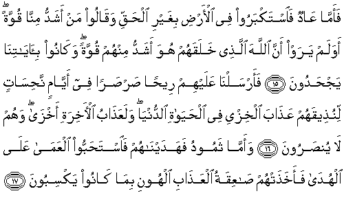 (bilerek) inkar ediyorlardı. 16. Böylece Biz de onlara dünya hayatında aşağılanma azabını taddırmak için, o uğursuz (felaketler yüklü) günlerde üzerlerine 'kulakları patlatan bir kasırga' gönderdik. Ahiret azabı ise daha (büyük) bir aşağılanmadır. Ve onlara yardım edilmeyecektir. 17.Semud'a gelince; Biz onlara doğru yolu gösterdik, fakat onlar körlüğü hidayete tercih ettiler. Böylece kazandıkları şeyler yüzünden onları alçaltıcı azabın yıldırımı yakalayıverdi. |