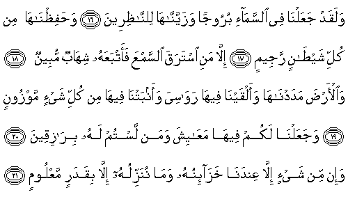 süsledik. 17.Ve onu her kovulan şeytandan koruduk. 18. Ancak kulak hırsızlığı yapan olursa, onu da parlak bir ateş izler. 19.Yere (gelince,) onu döşeyip-yaydık, onda sarsılmaz-dağlar bıraktık ve onda herşeyden ölçüsü belirlenmiş ürünler bitirdik. 20.Ve orda sizler için ve kendisine rızık vericiler olmadığınız kimseler (varlıklar ve canlılar) için geçimlikler kıldık. 21.Hiçbir şey yoktur ki, hazineleri Bizim Katımız'da olmasın; ancak onu belirlenmiş bir miktar olarak indiririz. |