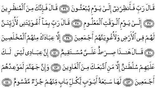 bana süre tanı." 37.Dedi ki: "Öyleyse, sen (kendisine) süre tanınanlardansın." 38."Bilinen günün vaktine kadar." 39.Dedi ki: "Rabbim, beni kışkırttığın şeye karşılık, andolsun, ben de yeryüzünde onlara, (sana başkaldırmayı ve dünya tutkularını) süsleyip-çekici göstereceğim ve onların tümünü mutlaka kışkırtıp-saptıracağım." 40."Ancak onlardan muhlis olan kulların müstesna." 41.(Allah) Dedi ki: "İşte bu, Bana göre dosdoğru olan yoldur." 42."Şüphesiz, kışkırtılıp-saptırılmışlardan sana uyanlar dışında, senin Benim kullarım üzerinde zorlayıcı hiçbir gücün yoktur." 43."Ve hiç şüphe yok, onların tümünün buluşma yeri cehennemdir." 44.Onun yedi kapısı vardır; onlardan her bir kapı için bir grup ayrılmıştır. |