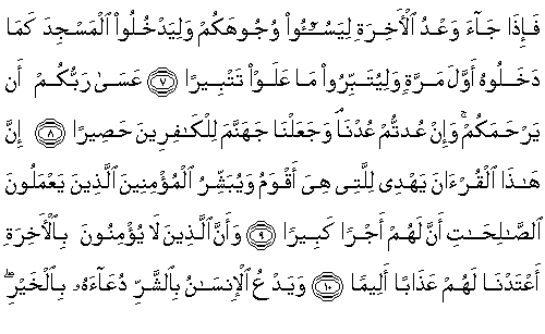 'darmadağın edip mahvetsinler.' 8.Umulur ki, Rabbiniz size merhamet eder, fakat siz (bozgunculuğa) dönerseniz Biz de (sizi aşağılık kılmaya ve cezalandırmaya) döneriz. Biz, cehennemi kafirler için bir kuşatma yeri kıldık. 9.Şüphesiz, bu Kur'an, en doğru yola iletir ve salih amellerde bulunan mü'minlere, onlar için gerçekten büyük bir ecir olduğunu müjde verir. 10.Ve şüphesiz, ahirete inanmayanlar için de acı bir azap hazırlamışızdır. |
