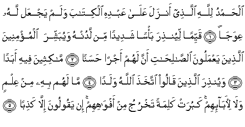 1. Hamd, Kitab'ı kulu üzerine indiren ve onda hiçbir çarpıklık kılmayan Allah'a aittir. 2.Dosdoğru (bir Kitap'tır) ki, Kendi Katından şiddetli bir azapla uyarıp-korkutmak ve salih amellerde bulunan mü'minlere müjde vermek için (onu indirdi); şüphesiz onlara güzel bir ecir vardır. 3.Onlar orda ebedi olarak kalıcıdırlar. 4.(Bu Kur'an) "Allah çocuk edindi" diyenleri uyarıp-korkutur. 5.Bu konuda ne kendilerinin, ne atalarının hiçbir bilgisi yoktur. Ağızlarından çıkan söz ne (kadar da) büyük. Onlar yalandan başkasını söylemiyorlar. |