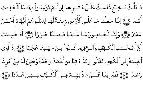 onların peşi sıra esef ederek kendini kahredeceksin (öyle mi)? 7.Şüphesiz Biz, yeryüzü üzerindeki şeyleri ona bir süs kıldık; onların hangisinin daha güzel davranışta bulunduğunu deneyelim diye. 8.Biz gerçekten (yeryüzü) üzerinde olanları kupkuru-çorak bir toprak yapabiliriz. 9.Sen, yoksa Kehf ve Rakim Ehlini Bizim şaşılacak ayetlerimizden mi sandın? 10.O gençler, mağaraya sığındıkları zaman, demişlerdi ki: "Rabbimiz, Katından bize bir rahmet ver ve işimizden bize doğruyu kolaylaştır (bizi başarılı kıl). 11.Böylelikle mağarada yıllar yılı onların kulaklarına vurduk (derin bir uyku verdik). |