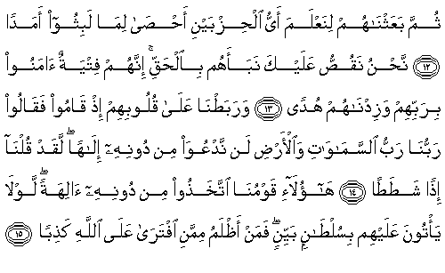 hesap ettiğini belirtmek için onları uyandırdık. 13.Biz sana onların haberlerini bir gerçek (olay) olarak aktarıyoruz. Gerçekten onlar Rablerine iman etmiş gençlerdi ve Biz de onların hidayetlerini artırmıştık. 14.Onların kalpleri üzerinde (sabrı ve kararlılığı) rabtetmiştik; (Krala karşı) Kıyam ettiklerinde demişlerdi ki: "Bizim Rabbimiz, göklerin ve yerin Rabbidir; İlah olarak biz O'ndan başkasına kesinlikle tapmayız, (eğer tersini) söyleyecek olursak, andolsun, gerçeğin dışına çıkarız." 15. "Şunlar, bizim kavmimizdir; O'ndan başkasını ilahlar edindiler, onlara apaçık bir delil getirmeleri gerekmez miydi? Öyleyse Allah'a karşı yalan uydurup iftira düzenden daha zalim kimdir?" |