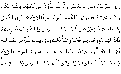 miktarını) yaysın ve işinizden size bir yarar kolaylaştırsın." 17.(Onlara baktığında) Görürsün ki, güneş doğduğunda mağaralarına sağ yandan yönelir, battığında onları sol yandan keser-geçerdi ve onlar da onun (mağaranın) geniş boşluğundalardı. Bu, Allah'ın ayetlerindendir. Allah, kime hidayet verirse, işte hidayet bulan odur, kimi saptırırsa onun için asla doğru-yolu gösterici bir veli bulamazsın. |
