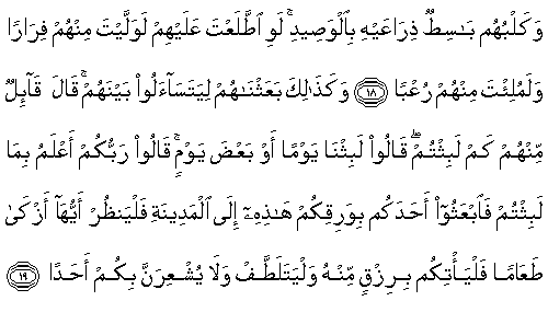 onlardan kaçardın, onlardan içini korku kaplardı. 19.Böylece, aralarında bir sorgulama yapsınlar diye onları dirilttik (uyandırdık). İçlerinden bir sözcü dedi ki: "Ne kadar kaldınız?" Dediler ki: "Bir gün veya günün bir (kaç saatlik) kısmı kadar kaldık." Dediler ki: "Ne kadar kaldığınızı Rabbiniz daha iyi bilir; şimdi birinizi bu paranızla şehre gönderin de, hangi yiyecek temizse baksın, size ondan bir rızık getirsin; ancak oldukça nazik davransın ve sakın sizi kimseye sezdirmesin." |