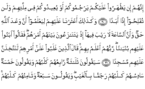kurtuluş bulamazsınız." 21. Böylece, Allah'ın va'dinin hak olduğunu ve gerçekten kıyametin, kendisinde şüphe bulunmadığını bilmeleri için (şehir halkına ve sonraki insan kuşaklarına) onları buldurmuş olduk. (Onları görenler) Kendi aralarında durumlarını tartışıyorlardı, (bir kısmı) dedi ki: "Onların üstüne bir bina inşa edin, Rableri onları daha iyi bilir." Onların işine galip gelen (sözleri geçen)ler ise: "Üstlerine mutlaka bir mescid yapmalıyız" dediler. |
