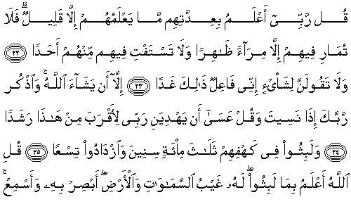 başka tartışma ve onlar hakkında bunlardan hiç kimseye bir şey sorma. 23.Hiçbir şey hakkında: "Ben bunu yarın mutlaka yapacağım" deme. 24.Ancak: "Allah dilerse" (inşaAllah yapacağım de). Unuttuğun zaman Rabbini zikret ve de ki: "Umulur ki, Rabbim beni bundan daha yakın bir başarıya yöneltip-iletir." 25.Onlar mağaralarında üç yüz yıl kaldılar ve dokuz (yıl) daha kattılar. |