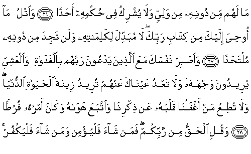 27- Sana Rabbinin kitabından vahyedileni oku. O'nun sözlerini değiştirici yoktur ve O'nun dışında kesin olarak bir sığınacak (makam) bulamazsın. 28- Sen de sabah akşam O'nun rızasını isteyerek Rablerine dua edenlerle birlikte sabret. Dünya hayatının (aldatıcı) süsünü isteyerek gözlerini onlardan kaydırma. Kalbini Bizi zikretmekten gaflete düşürdüğümüz, kendi 'istek ve tutkularına (hevasına)' uyan ve işinde aşırılığa gidene itaat etme. |