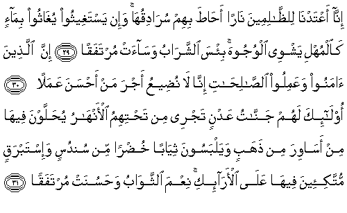 29- Ve de ki: "Hak Rabbinizdendir; artık dileyen iman etsin, dileyen inkar etsin. Şüphesiz Biz zalimlere bir ateş hazırlamışız, onun duvarları kendilerini çepeçevre kuşatmıştır. Eğer onlar yardım isterlerse, katı bir sıvı gibi yüzleri kavurup-yakan bir su ile yardım edilirler. Ne kötü bir içkidir o ve ne kötü bir destektir. 30- Şüphesiz iman edip salih amellerde bulunanlar ise; Biz gerçekten en güzel davranışta bulunanın ecrini kayba uğratmayız. 31- Onlar; altından ırmaklar akan Adn cennetleri onlarındır, orada altın bileziklerle süslenirler, hafif ipekten ve ağır işlenmiş atlastan yeşil elbiseler giyerler ve tahtlar üzerinde kurulup-dayanırlar. (Bu,) Ne güzel sevap ve ne güzel destek. 32- Onlara iki adamın örneğini ver; onlardan birine iki üzüm bağı verdik ve ikisini hurmalıklarla donattık, ikisinin arasında da ekinler bitirmiştik. |