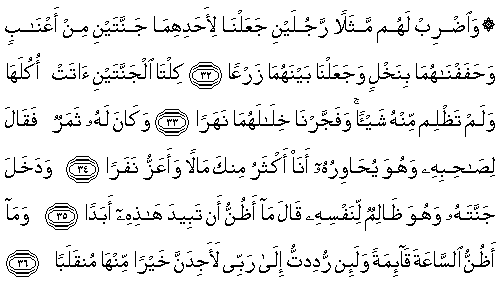 33- İki bağ da yemişlerini vermiş, ondan (verim bakımından) hiçbir şeyi noksan bırakmamış ve aralarında bir ırmak fışkırtmıştık. 34- (İkisinden) Birinin başka ürün (veren yer)leri de vardı. Böylelikle onunla konuşurken arkadaşına dedi ki: “Ben, mal bakımından senden daha zenginim, insan sayısı bakımından da daha güçlüyüm.” 35- Kendi nefsinin zalimi olarak (böylece) bağına girdi (ve): "Bunun sonsuza kadar kuruyup-yok olacağını sanmıyorum" dedi. 36- "Kıyamet-saatinin kopacağını da sanmıyorum. Buna rağmen Rabbime döndürülecek olursam, şüphesiz bundan daha hayırlı bir sonuç bulacağım." |
