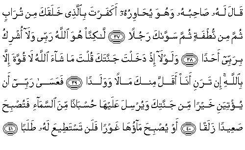 37- Kendisiyle konuşmakta olan arkadaşı ona dedi ki: "Seni topraktan, sonra bir damla sudan yaratan, sonra da seni düzgün (eli ayağı tutan, gücü kuvveti yerinde) bir adam kılan (Allah)ı inkar mı ettin?" 38- "Fakat, O Allah benim Rabbimdir ve ben Rabbime hiç kimseyi ortak koşmam." 39- "Bağına girdiğin zaman, 'MaşaAllah, Allah'tan başka kuvvet yoktur' demen gerekmez miydi? Eğer beni mal ve çocuk bakımından senden daha az (güçte) görüyorsan." 40- "Belki Rabbim senin bağından daha hayırlısını bana verir, (seninkinin) üstüne gökten 'yakıp-yıkan bir afet' gönderir de kaygan bir toprak kesiliverir." 41- "Veya onun suyu dibe göçüverir de böylelikle onu arayıp-bulmaya kesinlikle güç yetiremezsin." |