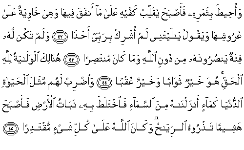 42- (Derken) Onun ürünleri (afetlerle) kuşatılıverdi. Artık o, uğrunda harcadıklarına karşı avuçlarını (esefle) oğuşturuyordu. O (bağın) çardakları yıkılmış durumdaydı, kendisi de şöyle diyordu: "Keşke Rabbime hiç kimseyi ortak koşmasaydım." 43- Allah'ın dışında ona yardım edecek bir topluluk yoktu, kendi kendine de yardım edemedi. 44- İşte burada (bu durumda) velayet (yardımcılık, dostluk) hak olan Allah'a aittir. O, sevap bakımından hayırlı, sonuç bakımından hayırlıdır. 45- Onlara, dünya hayatının örneğini ver; gökten indirdiğimiz suya benzer, onunla yeryüzünün bitkileri birbirine karıştı, böylece rüzgarların savurduğu çalı-çırpı oluverdi. Allah, herşeyin üzerinde güç yetirendir. |