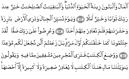 46- Mal ve çocuklar, dünya hayatının çekici-süsüdür; sürekli olan 'salih davranışlar' ise, Rabbinin Katında sevap bakımından daha hayırlıdır, umut etmek bakımından da daha hayırlıdır. 47- Dağları yürüteceğimiz gün, yeri çırılçıplak (dümdüz olmuş) görürsün; onları birarada toplamışız da, içlerinden hiçbirini dışarda bırakmamışızdır. 48- Onlar senin Rabbine sıra sıra sunulmuşlardır. Andolsun, siz ilk defa yarattığımız gibi Bize gelmiş oldunuz. Hayır, Bizim size bir kavuşma-zamanı tespit etmediğimizi sanmıştınız değil mi? |