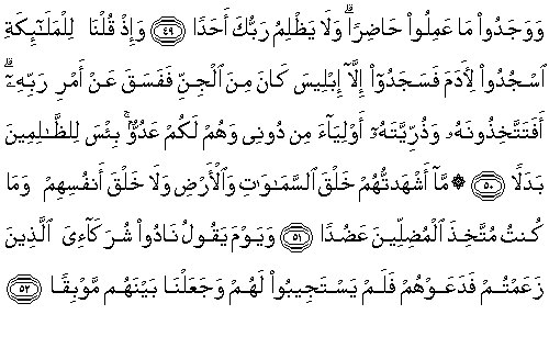 49- (Önlerine) Kitap konulmuştur; artık suçlu-günahkarların, onda olanlardan dolayı dehşetle-korkuya kapıldıklarını görürsün. Derler ki: "Eyvahlar bize, bu kitaba ne oluyor ki, küçük büyük bırakmayıp herşeyi sayıp-döküyor?" Yapıp-ettiklerini (önlerinde) hazır bulmuşlardır. Rabbin hiç kimseye zulmetmez. 50- Hani meleklere: "Adem'e secde edin" demiştik; İblis'in dışında (diğerleri) secde etmişlerdi. O cinlerdendi, böylelikle Rabbinin emrinden dışarı çıkmıştı. Bu durumda Beni bırakıp onu ve onun soyunu veliler mi edineceksiniz? Oysa onlar sizin düşmanlarınızdır. (Bu,) Zalimler için ne kadar kötü bir (tercih) değiştirmedir. 51- Göklerin ve yerin yaratılışında da, kendi nefislerinin yaratılışında da Ben onları şahid tutmadım. Ben, saptırıcıları yardımcı-güç de edinmedim. 52- (Kafirlere) "Benim ortaklarım sandığınız şeyleri çağırın" diyeceği gün; işte onları çağırmışlardır, ama onlar, kendilerine cevap vermemişlerdir. Biz onların aralarında bir uçurum koyduk. |