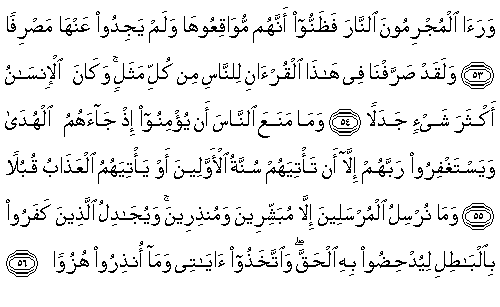 53- Suçlu-günahkarlar ateşi görmüşlerdir, artık içine kendilerinin gireceklerini de anlamışlardır; ancak ondan bir kaçış yolu bulamamışlardır. 54- Andolsun, bu Kur'an'da insanlar için Biz her örnekten çeşitli açıklamalarda bulunduk. İnsan, herşeyden çok tartışmacıdır. 55- Kendilerine hidayet geldiği zaman insanları inanmaktan ve Rablerinden bağışlanma dilemelerinden alıkoyan şey, ancak evvelkilerin sünnetinin kendilerine de gelmesi veya azabın onları karşılarcasına gelmesi(ni beklemeleri)dir. 56- Biz elçileri, müjde vericiler ve uyarıcılar olmak dışında (başka bir amaçla) göndermeyiz. İnkar edenler ise, hakkı batıl ile geçersiz kılmak için mücadele ediyorlar. Onlar Benim ayetlerimi ve uyarıldıklarını (azabı) alay konusu edindiler. |