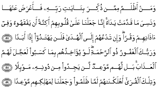 57- Kendisine Rabbinin ayetleri öğütle hatırlatıldığı zaman, sırt çeviren ve ellerinin önden gönderdikleri (amelleri)ni unutandan daha zalim kimdir? Biz gerçekten, kalpleri üzerine onu kavrayıp anlamalarını engelleyen bir perde (gerdik), kulaklarına bir ağırlık koyduk. Sen onları hidayete çağırsan bile, onlar sonsuza kadar asla hidayet bulamazlar. 58- Senin Rabbin rahmet sahibi (ve) bağışlayıcıdır. Eğer, kazandıklarından dolayı onları (azapla) yakalasaydı, şüphesiz onlara azabı (bir an önce) çabuklaştırırdı. Hayır, onlar için bir buluşma zamanı vardır, onun dışında asla başka bir sığınak bulamayacaklardır. 59- İşte ülkeler (ve onların halkları), zulmettikleri zaman onları yıkıma uğrattık; ve yıkımları için bir buluşma zamanı tespit ettik. |