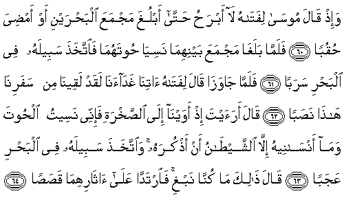geçireceğim." 61.Böylece ikisi, iki (deniz)in birleştiği yere ulaşınca balıklarını unutuverdiler; (balık) denizde bir akıntıya doğru (veya bir menfez bulup) kendi yolunu tuttu. 62.(Varmaları gereken yere gelip) Geçtiklerinde (Musa) genç-yardımcısına dedi ki: "Yemeğimizi getir bize, andolsun, bu yaptığımız-yolculuktan gerçekten yorulduk." 63.(Genç-yardımcısı) Dedi ki: "Gördün mü, kayaya sığındığımızda, ben balığı unuttum. Onu hatırlamamı şeytandan başkası bana unutturmadı; o da şaşılacak tarzda denizde kendi yolunu tuttu." 64.(Musa) Dedi ki: "Bizim de aradığımız buydu." Böylelikle ikisi izleri üzerinde geriye doğru gittiler. |