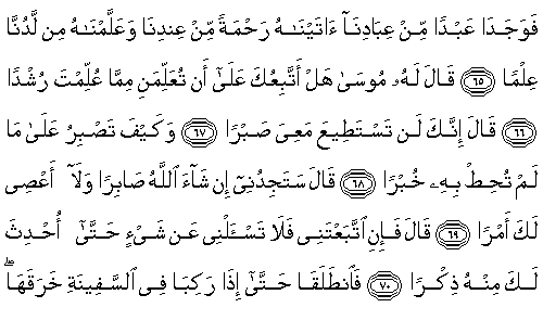 buldular. 66.Musa ona dedi ki: "Doğru yol (rüşd) olarak sana öğretilenden bana öğretmen için sana tabi olabilir miyim?" 67.Dedi ki: "Gerçekten sen, benimle birlikte olma sabrını göstermeye güç yetiremezsin." 68.(Böyleyken) "Özünü kavramaya kuşatıcı olamadığın şeye nasıl sabredebilirsin?" 69.(Musa:) "İnşaAllah, beni sabreden (biri olarak) bulacaksın. Hiçbir işte sana karşı gelmeyeceğim" dedi. 70.Dedi ki: "Eğer bana uyacak olursan, hiçbir şey hakkında bana soru sorma, ben sana öğütle-anlatıp söz edinceye kadar." |