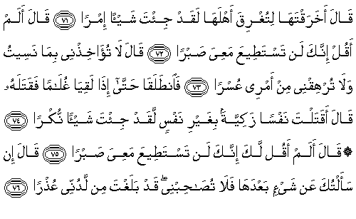 mi onu deldin? Andolsun, sen şaşırtıcı bir iş yaptın." 72.Dedi ki: "Gerçekten benimle birlikte olma sabrını göstermeye kesinlikle güç yetiremeyeceğini ben sana söylemedim mi?" 73. (Musa:) "Beni, unuttuğumdan dolayı sorgulama ve bu işimden dolayı bana zorluk çıkarma" dedi. 74.Böylece ikisi (yine) yola koyuldular. Nitekim bir çocukla karşılaştılar, o hemen tutup onu öldürüverdi. (Musa) Dedi ki: "Bir cana karşılık olmaksızın, tertemiz bir canı mı öldürdün? Andolsun, sen kötü bir iş yaptın." 75.Dedi ki: "Gerçekte benimle birlikte olma sabrını göstermeye kesinlikle güç yetiremeyeceğini ben sana söylemedim mi?" 76.(Musa:) "Bundan sonra sana bir şey soracak olursam, artık benimle arkadaşlık etme. Benden yana bir özre ulaşmış olursun" dedi. |