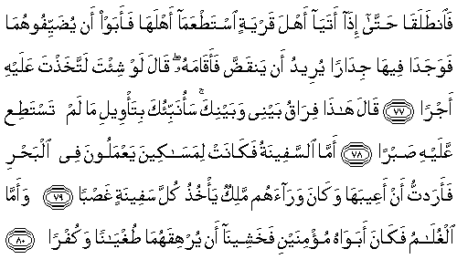 bir ücret alabilirdin." 78.Dedi ki: "İşte bu, benimle senin aranda ayrılma (zamanı)mız. Sana, üzerinde sabır göstermeye güç yetiremeyeceğin bir yorumu haber vereceğim. 79."Gemi, denizde çalışan yoksullarındı, onu kusurlu yapmak istedim, (çünkü) ilerilerinde, her gemiyi zorbalıkla ele geçiren bir kral vardı." 80."Çocuğa gelince, onun anne ve babası mü'min kimselerdi. Bundan dolayı, onun kendilerine azgınlık ve inkar zorunu kullanmasından endişe edip-korktuk." |