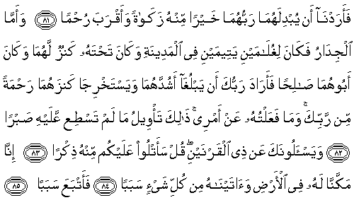 diledik." 82."Duvar ise, şehirde iki öksüz çocuğundu, altında onlara ait bir define vardı; babaları salih biriydi. Rabbin diledi ki, onlar erginlik çağına erişsinler ve kendi definelerini çıkarsınlar; (bu,) Rabbinden bir rahmettir. Bunları ben, kendi işim (özel görüşüm) olarak yapmadım. İşte, senin sabır göstermeye güç yetiremediğin şeylerin yorumu." 83.Sana (Ey Muhammed,) Zu'l-Karneyn hakkında sorarlar. De ki: "Size, ondan 'öğüt ve hatırlatma olarak' (bazı bilgiler) vereceğim. 84.Gerçekten, Biz ona yeryüzünde sapasağlam bir iktidar verdik ve ona herşeyden bir yol (sebep) verdik. 85.O da, bir yol tuttu. |