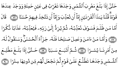 içlerinde güzelliği (geçerli ilke) edinirsin." 87.Dedi ki: "Kim zulmederse biz onu azaplandıracağız, sonra Rabbine döndürülür, O da onu görülmemiş bir azapla azaplandırır." 88.Kim iman eder ve salih amellerde bulunursa, onun için güzel bir karşılık vardır. Ona buyruğumuzdan kolay olanını söyleyeceğiz." 89.Sonra (yine) bir yol tuttu. 90.Sonunda güneşin doğduğu yere kadar ulaştı ve onu (güneşi), kendileri için bir siper kılmadığımız bir kavim üzerine doğmakta iken buldu. |