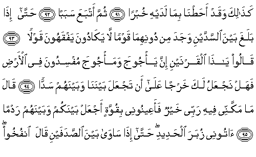 (veya yanında olup-biten herşeyi) Biz (ilmimizle) büsbütün kuşatmıştık.. 92.Sonra bir yol (daha) tuttu. 93.İki seddin arasına kadar ulaştı, onların (sedlerin) önünde hemen hemen hiçbir sözü kavramayan bir kavim buldu. 94.Dediler ki: "Ey Zu'l-Karneyn, gerçekten Ye'cuc ve Me'cuc, yeryüzünde bozgunculuk çıkarıyorlar, bizimle onlar arasında bir sed inşa etmen için sana vergi verelim mi?" 95.Dedi ki: "Rabbimin beni kendisinde sağlam bir iktidarla yerleşik kıldığı (güç, nimet ve imkan), daha hayırlıdır. Madem öyle, bana (insani) güçle yardım edin de, sizinle onlar arasında sapasağlam bir engel kılayım." |