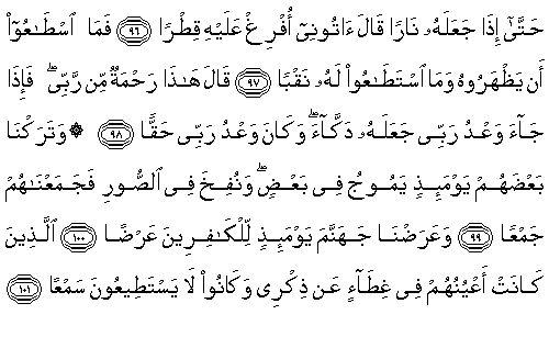 dökeyim." 97.Böylelikle, ne onu aşabildiler, ne onu delmeye güç yetirebildiler. 98.Dedi ki: "Bu benim Rabbimden bir rahmettir. Rabbimin va'di geldiği zaman, O, bunu dümdüz eder; Rabbimin va'di haktır." 99.Biz o gün, bir kısmını bir kısmı içinde dalgalanırcasına bırakıvermişiz. Sur'a da üfürülmüştür, artık onların tümünü birarada toparlamışız. 100.Ve o gün, cehennemi, inkar edenlere tam bir sunuşla sunmuşuz. 101.Ki onlar, Beni zikretme (konusun)da gözleri bir perde içindeydi. (Kur'an'ı) dinlemeye katlanamazlardı. |