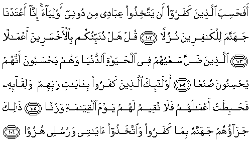 durak olarak hazırlamışız. 103.De ki: "Davranış (ameller) bakımından en çok hüsrana uğrayacak olanları size haber vereyim mi?" 104."Onların, dünya hayatındaki bütün çabaları boşa gitmişken, kendilerini gerçekte güzel iş yapmakta sanıyorlar." 105.İşte onlar, Rablerinin ayetlerini ve O'na kavuşmayı inkar edenlerdir. Artık onların yapıp-ettikleri boşa çıkmıştır, kıyamet gününde onlar için bir tartı tutmayacağız. 106.İşte, inkar etmeleri, ayetlerimi ve elçilerimi alay konusu edinmelerinden dolayı onların cezası cehennemdir. |
