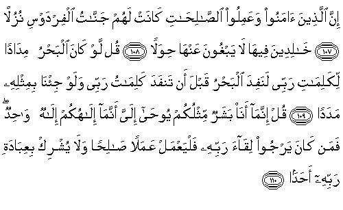 cennetleri onlar için bir 'konaklama yeridir.' 108.Onda ebedi olarak kalıcıdırlar, ondan ayrılmak istemezler. 109.De ki: "Rabbimin sözleri(ni yazmak) için deniz mürekkep olsa ve yardım için bir benzerini (bir o kadarını) dahi getirsek, Rabbimin sözleri tükenmeden önce, elbette deniz tükeniverirdi. 110.De ki: "Şüphesiz ben, ancak sizin benzeriniz olan bir beşerim; yalnızca bana sizin İlahınızın tek bir İlah olduğu vahyolunuyor. Kim Rabbine kavuşmayı umuyorsa, artık salih bir amelde bulunsun ve Rabbine ibadette hiç kimseyi ortak tutmasın." |