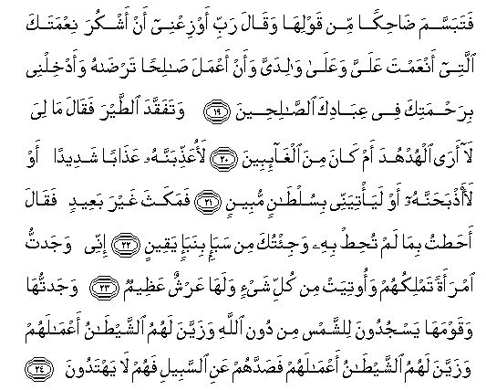 herşeyden (bolca) verilmiştir ve büyük bir tahtı var."24."Onu ve kavmini, Allah'ı bırakıp da güneşe secde etmektelerken buldum, şeytan onlara yaptıklarını süslemiştir, böylece onları (doğru) yoldan alıkoymuştur; bundan dolayı onlar hidayet bulmuyorlar." |