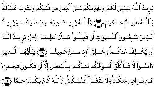 27.Allah, tevbelerinizi kabul etmek ister; şehvetleri ardınca gidenler ise, sizin büyük bir sapma ile sapmanızı isterler. 28.Allah (ağır yükleri) sizden hafifletmek ister: (Çünkü) insan zayıf olarak yaratılmıştır. 29.Ey iman edenler, mallarınızı, sizden karşılıklı anlaşmadan (doğan) bir ticaretten başka haksız 'nedenler ve yollarla’ (batılca) yemeyin. Ve kendi nefislerinizi öldürmeyin. Şüphesiz, Allah, sizi çok esirgeyendir. |