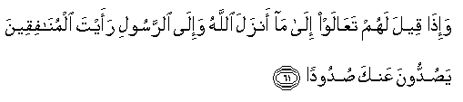 61.Onlara: "Allah'ın indirdiğine ve elçiye gelin" denildiğinde, o münafıkların senden kaçabildiklerince kaçtıklarını görürsün. |