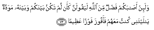 73.Eğer size Allah'tan bir fazl (zafer) isabet ederse, o zaman da, sanki onunla aranızda hiçbir yakınlık yokmuş gibi kuşkusuz şöyle der; "Keşke onlarla birlikte olsaydım, böylece ben de büyük 'kurtuluş ve mutluluğa' erseydim." |
