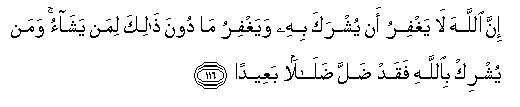 116.Hiç şüphesiz, Allah, Kendisi'ne şirk koşanları bağışlamaz. Bunun dışında kalanlar ise, (onlardan) dilediğini bağışlar. Kim Allah'a şirk koşarsa elbette o uzak bir sapıklıkla sapmıştır. |