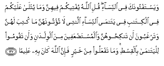 | 127.Kadınlar konusunda senden fetva isterler. De ki: "Onlara ilişkin fetvayı size Allah veriyor. (Bu fetva,) Kendilerine yazılan (hakları veya miras)ı vermediğiniz ve kendilerini nikahlamayı istediğiniz yetim kadınlar ve zayıf çocuklar (hakkında) ile yetimlere karşı adaleti ayakta tutmanız konusunda size kitapta okunmakta olanlardır. Hayır adına her ne yaparsanız, şüphesiz Allah onu bilir. | ![]() |