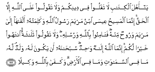 | 171.Ey Kitap Ehli, dininiz konusunda taşkınlık etmeyin, Allah'a karşı gerçek olandan başkasını söylemeyin. Meryem oğlu Mesih İsa, ancak Allah'ın elçisi ve kelimesidir. Onu (‘OL’ kelimesini) Meryem'e yöneltmiştir ve O'ndan bir ruhtur. Öyleyse Allah'a ve elçisine inanınız; "üçtür" demeyiniz. (Bundan) kaçının, sizin için hayırlıdır. Allah, ancak bir tek İlah'tır. O, çocuk sahibi olmaktan Yücedir. Göklerde ve yerde her ne varsa O'nundur. Vekil olarak Allah yeter. | ![]() |