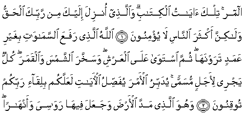 1.Elif, Lam, Mim, Ra. Bunlar Kitab'ın ayetleridir. Ve sana Rabbinden indirilen haktır. Ancak insanların çoğu iman etmezler. 2.Allah O'dur ki, gökleri dayanak olmaksızın yükseltti; onları görmektesiniz. Sonra arşa istiva etti ve güneş ile aya boyun eğdirdi, her biri adı konulmuş bir süreye kadar akıp gitmektedirler. Her işi evirip düzenler, ayetleri birer birer açıklar. Umulur ki, Rabbinize kavuşacağınıza kesin bilgiyle inanırsınız. |