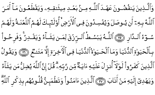 25- Allah'a verdikleri sözü, onu kesin olarak onayladıktan sonra bozanlar, Allah'ın ulaştırılmasını emrettiği şeyi kesip-koparanlar ve yeryüzünde bozgunculuk çıkaranlar; işte onlar, lanet onlar içindir ve yurdun kötü olanı da onlar içindir. 26- Allah dilediğine rızkı genişletir-yayar ve daraltır da. Onlar ise dünya hayatına sevindiler. Oysaki dünya hayatı, ahirette (ki sınırsız mutluluk yanında geçici) bir meta'dan başkası değildir. 27.İnkar edenler: "Ona Rabbinden bir ayet (mucize) indirilseydi ya!" derler. De ki: "Şüphesiz Allah, dilediğini şaşırtıp-saptırır, Kendisi'ne katıksızca yöneleni de dosdoğru yola yöneltip-iletir." |