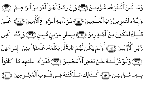 191. Ve şüphesiz, senin Rabbin, güçlü ve üstün olandır, esirgeyendir. 192. Gerçekten o (Kur'an), alemlerin Rabbinin (bir) indirmesidir. 193. Onu Ruhu'l-emin indirdi. 194. Uyarıcılardan olman için, senin kalbinin üzerine (indirmiştir). 195. Apaçık Arapça bir dille. 196. Ve hiç şüphesiz, o (Kur'an), geçmişlerin kitaplarında da vardır. 197. İsrailoğulları bilginlerinin onu bilmesi onlar için bir delil (ayet) değil mi? 198.Onu Arapça bilmeyen birine indirmiş olsaydık. 199. Böylece onlara okusaydı, yine ona iman edecek değillerdi. 200. Biz onu, suçlu-günahkarların kalbine işte böyle işlettik. |