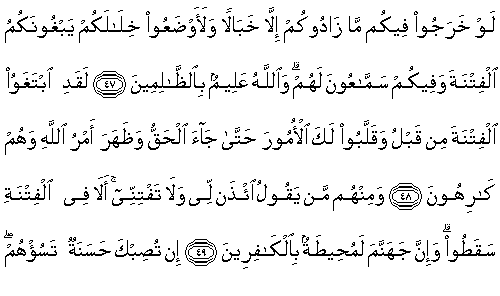 İçinizde onlara 'haber taşıyanlar' vardır. Allah, zulmedenleri bilir. 48.Andolsun, daha önce onlar fitne aramışlardı. Ve sana karşı birtakım işler çevirmişlerdi. Sonunda onlar, istemedikleri halde hak geldi ve Allah'ın emri ortaya çıkıp-üstünlük sağladı. 49.Onlardan bir kısmı: "Bana izin ver ve beni fitneye katma" der. Haberin olsun, onlar fitnenin (ta) içine düşmüşlerdir. Hiç şüphesiz cehennem, o inkar edenleri mutlaka çepeçevre kuşatıcıdır. |